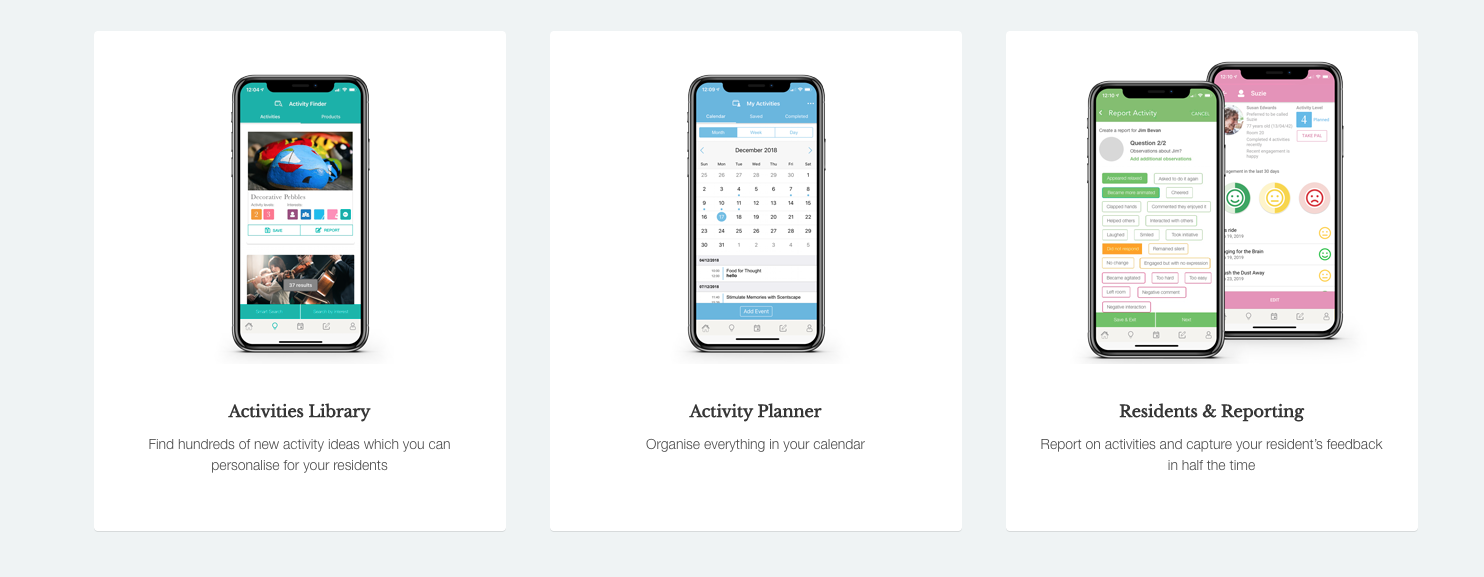 The app was designed to support the lifestyle and activity coordinators within care settings. It helps the carers save time by using the easy reporting tool and activity planner, plus it gives them creative support with the library of activities carefully customised for people living with dementia. Since its launch it has been receiving positive feedback.