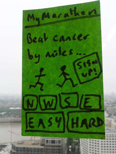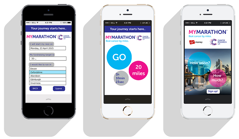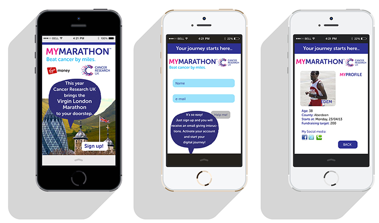 The brief was to present and promote a CRUK fundraising event; we grouped into teams and choose our project. My team decided to do a virtual marathon event that would be running alongside the London marathon. The idea was to get our message across compellingly by advertising the event to a broad audience across a variety of media, both offline and online. We wanted to inspire people from a wide range of age, cultural and social groups to donate or participate. In a few words: ‘Show optimism, show collectiveness, engage the user, stay close to the CRUK brand guidelines”.